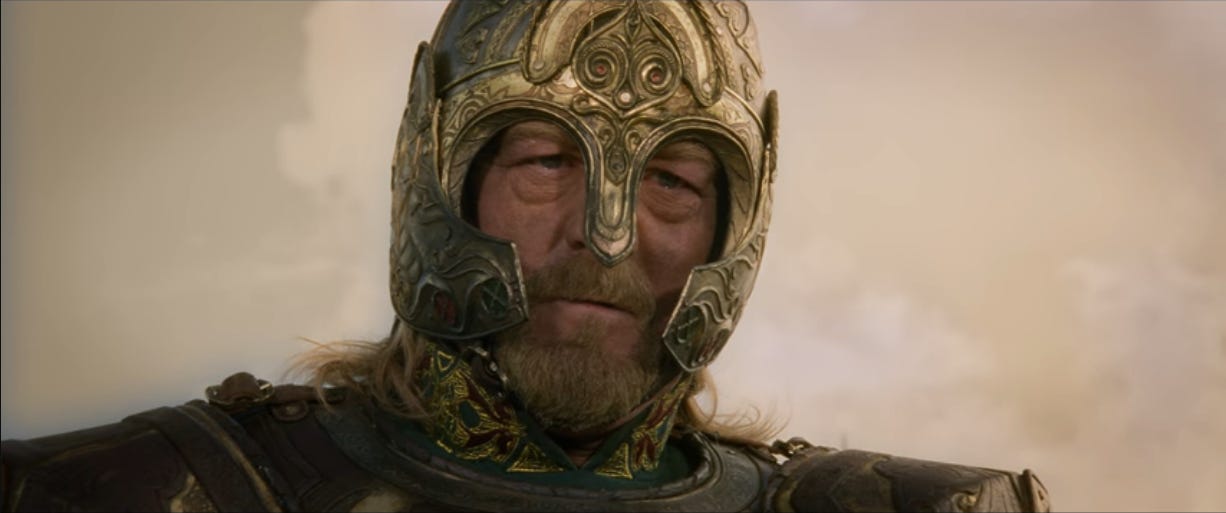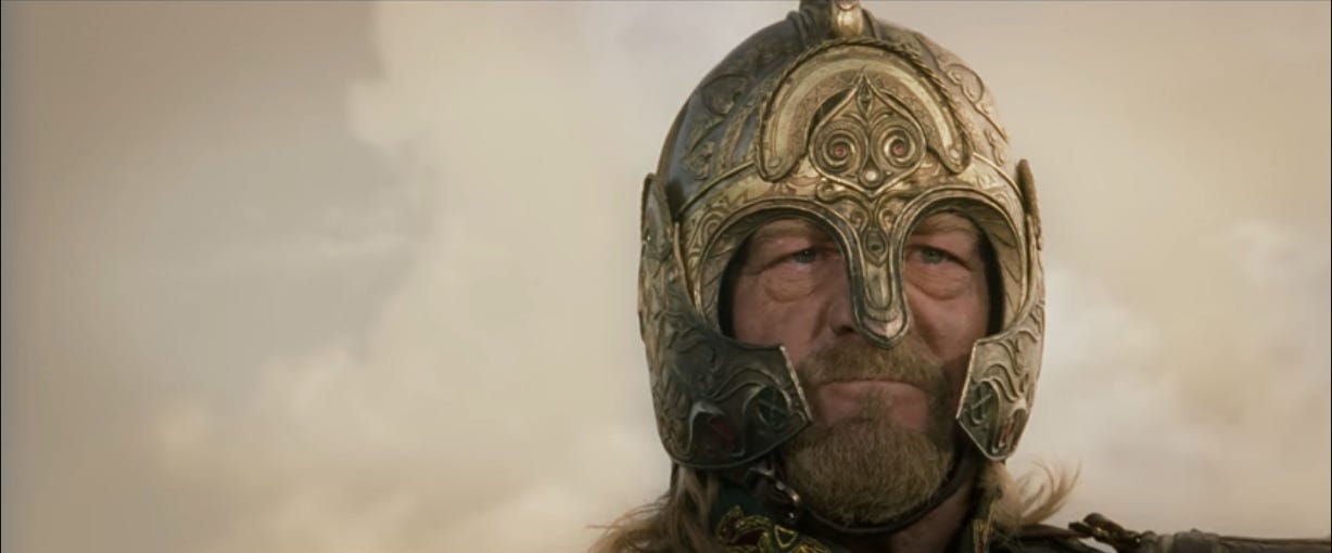 Because he’s never met an apocalypse he didn’t want to test his mettle against, Théoden fires up the troops as only he can.