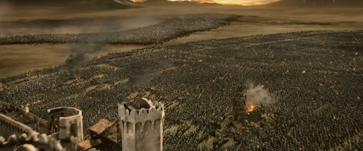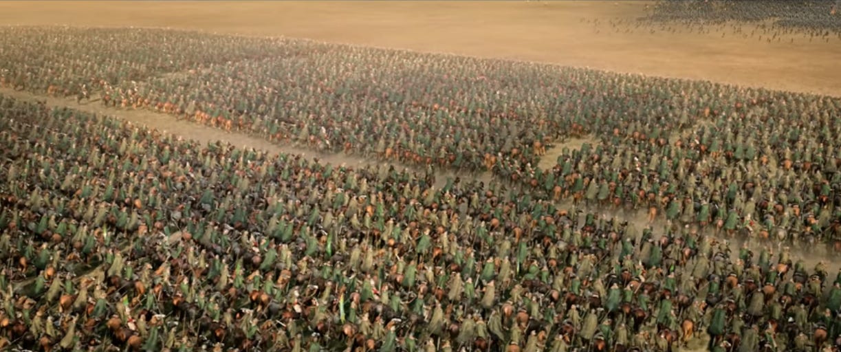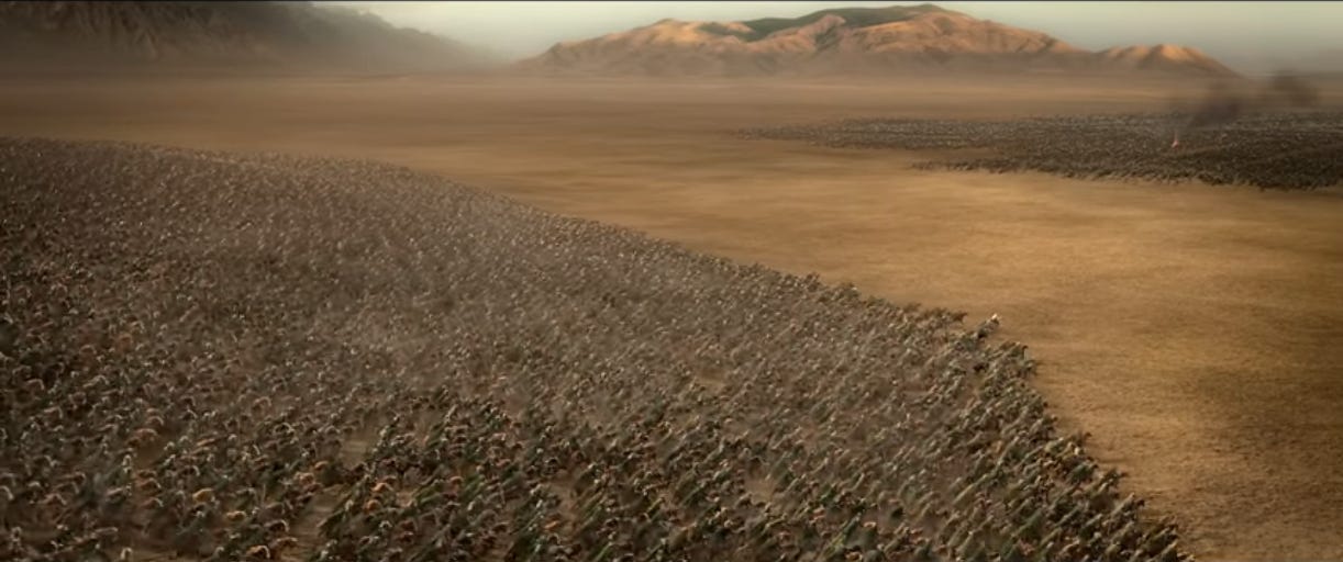 I read somewhere that this scene used about 250 extras and a lot of CGI to make it look like a massive force. Works pretty convincingly. Reminds me of Rogue One, where Cassian Andor says to “make 10 men feel like 100.” But like, bigger.