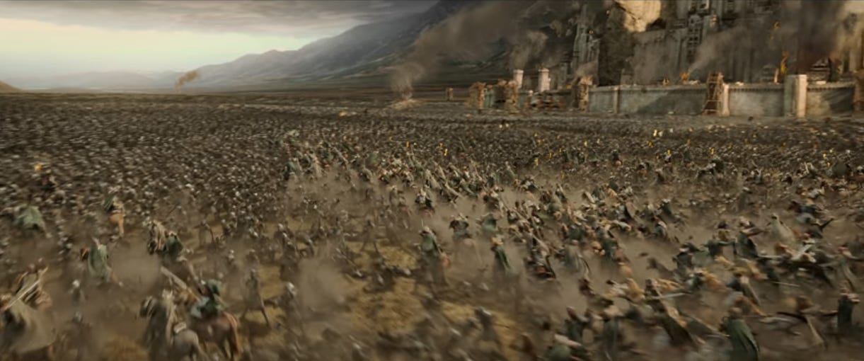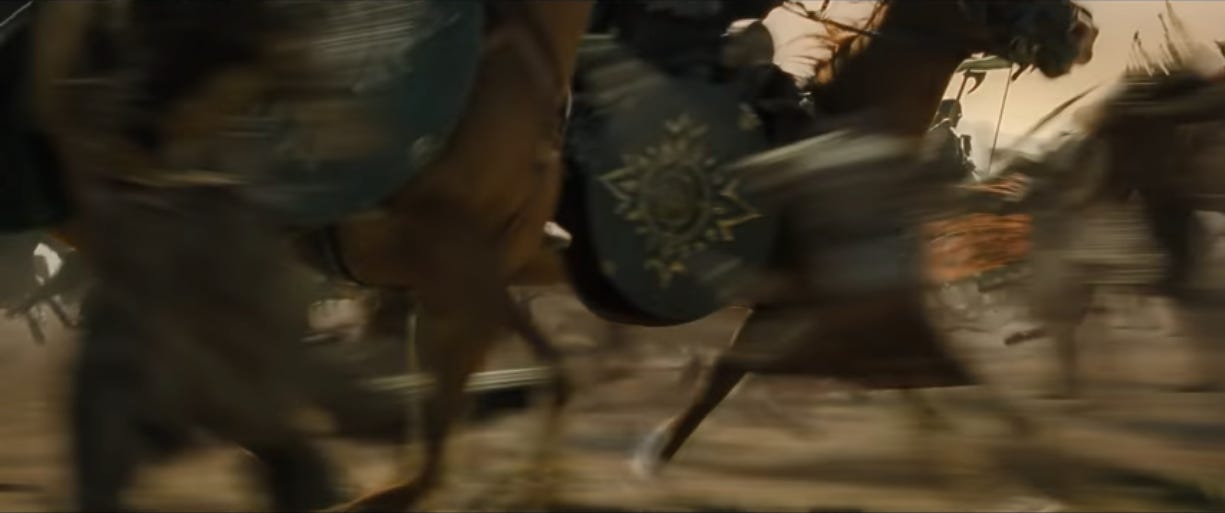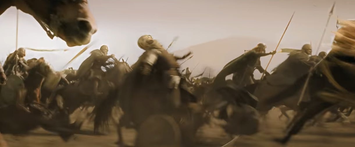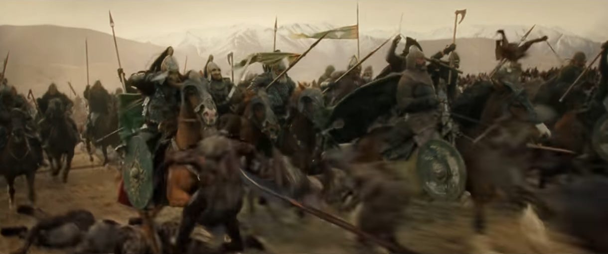 It’s been over a minute since the Rohirrim horns first reverberated across the battlefield. And they’re still arriving. Talk about build-up. The anticipation makes the actual charge so much sweeter.