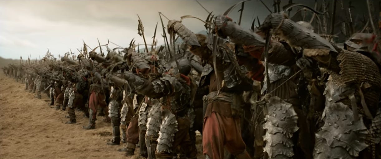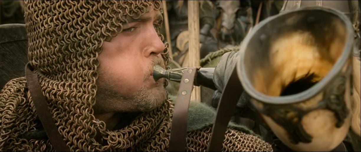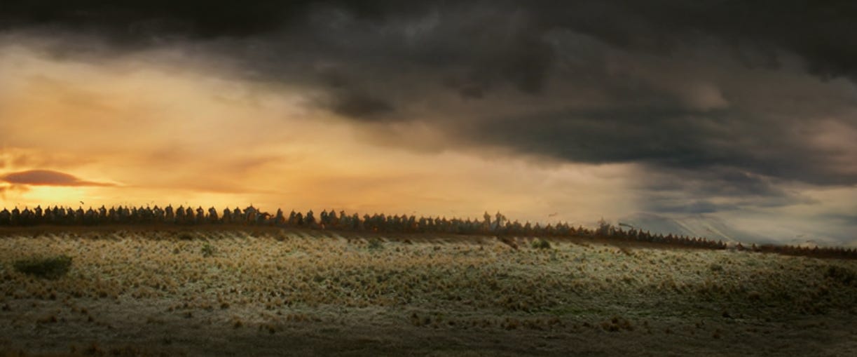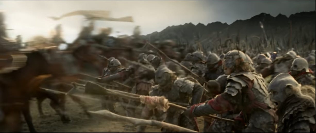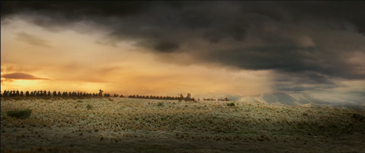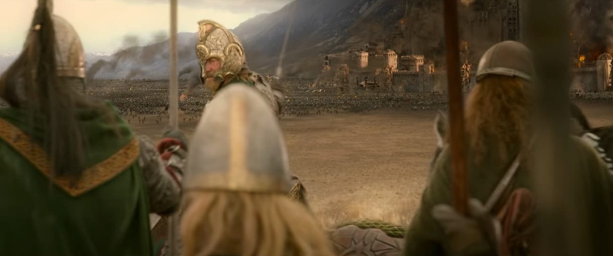 I tend to roll my eyes when cinephiles bemoan how streamers have eroded film as an art form, but when I look at this shot, they have a point. Often epic fantasy means dragons and elf-lords and, yes, titanic battles. But part of what makes this scene so incredible is how it builds.