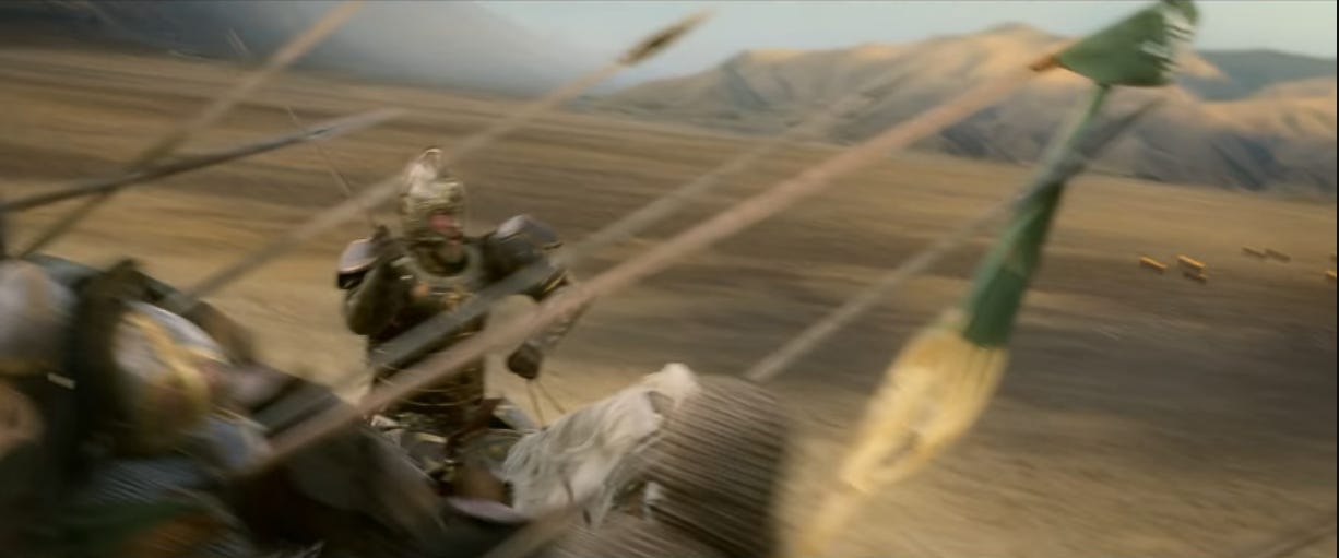 A totally pedantic detail, but this is the timestamp I’m using for the start of the charge because it’s when the Rohirrim appear.